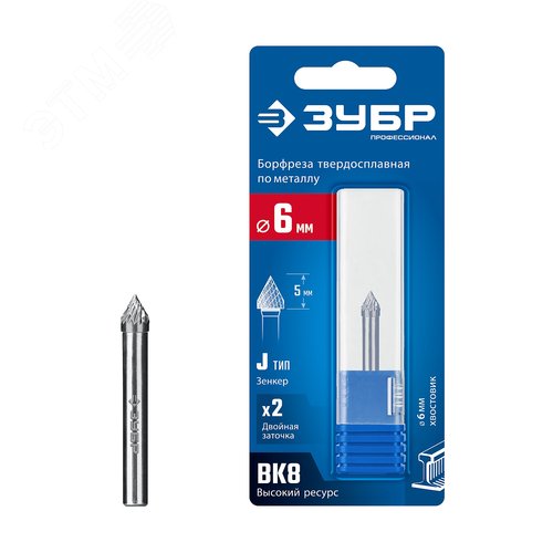 Борфреза твердосплавная, ПРОФЕССИОНАЛ тип J зенкер с вершиной 60°, 6х5 мм, хвостовик 6 мм