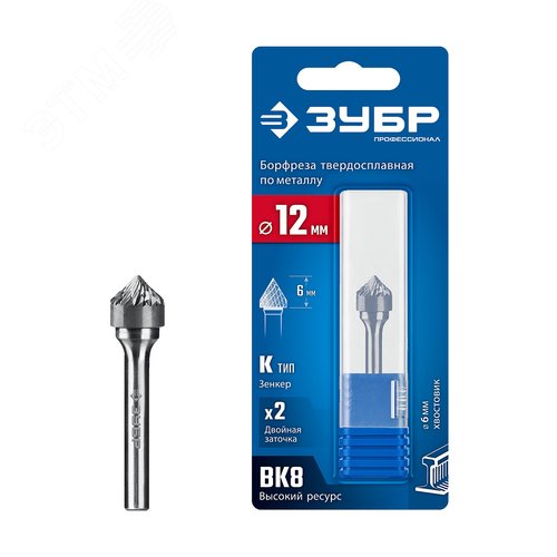 Борфреза твердосплавная, ПРОФЕССИОНАЛ тип K зенкер с вершиной 90°, 12х6 мм, хвостовик 6 мм