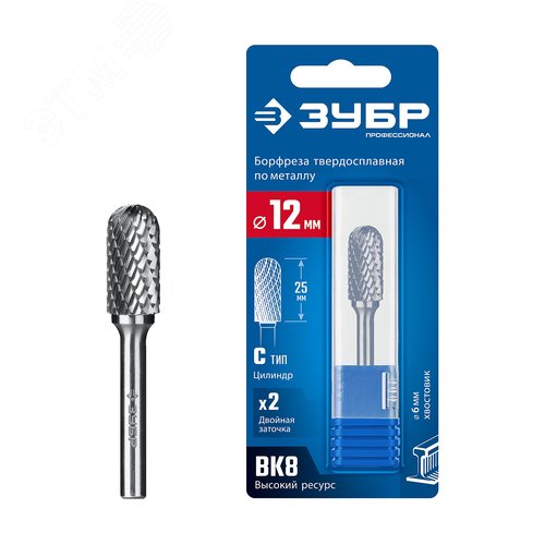 Борфреза твердосплавная, ПРОФЕССИОНАЛ тип C цилиндр со сферическим концом, 12х25 мм, хвостовик 6 мм