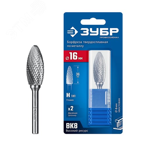 Борфреза твердосплавная, ПРОФЕССИОНАЛ тип H пламя, радиус 2.5 мм, 16х36 мм, хвостовик 6 мм
