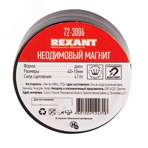 Неодимовый магнит диск 40х10мм сцепление 41 Кг