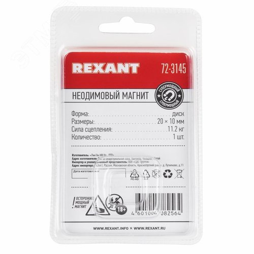 Неодимовый магнит диск 20х10мм сцепление 11.2 кг