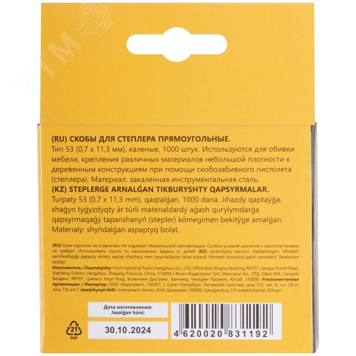 Скобы для степлера закаленные 11.3 мм х 0.7 мм, (узкие тип 53) 14 мм, 1000 шт