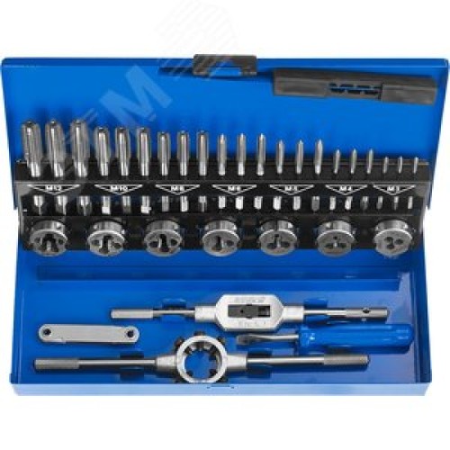 Комплектация 32 предмета плашки метрические( 7шт.) 3х0,5 4х0,7 5х0,8 6х1,0 8х1,25 10х1,5 12х1,75 . метчики метрические 7 комплектов№1,№2,№3( 21шт.)3х0,5 4х0,7 5х0,8 6х1,0 8х1,25 10х1,5 12х1,75. метчикодержатель m3m12., плашкодержатель m3m121шт., резьбомер1шт., отвертка1шт.