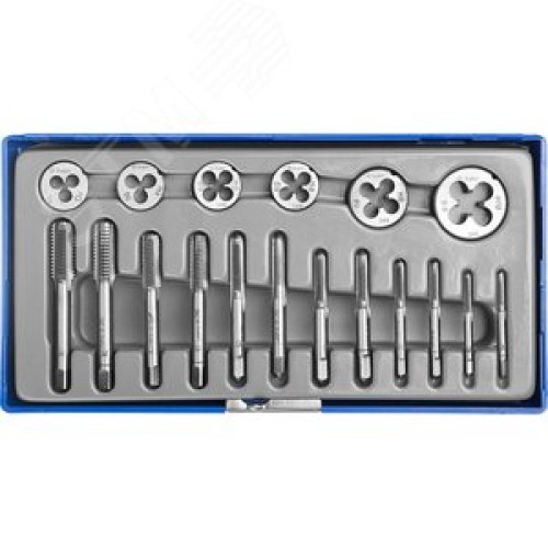 Набор метчиков и плашек в пластиковом боксе, сталь 9ХС 18 предметов