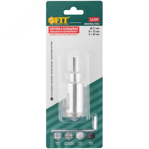 Коронка кольцевая по керамограниту, камню и кафелю алмазная с центровочным сверлом 22х67 мм