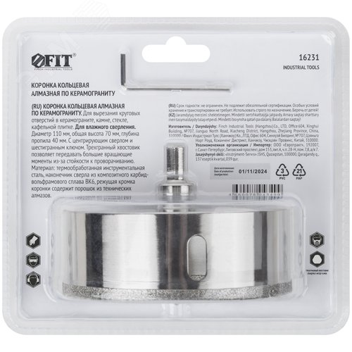 Коронка кольцевая по керамограниту, камню и кафелю алмазная с центровочным сверлом 110х70 мм