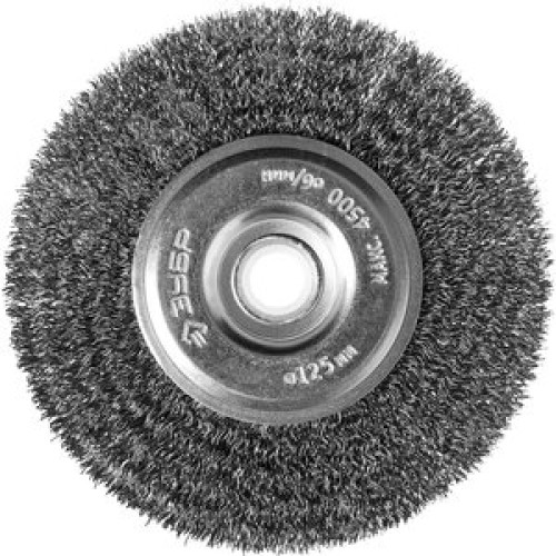 Щетка дисковая для точильно-шлифовального станка, витая стальная проволока 0,3мм, 125х12,7мм ''Профессионал''.