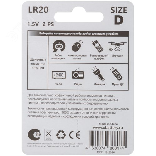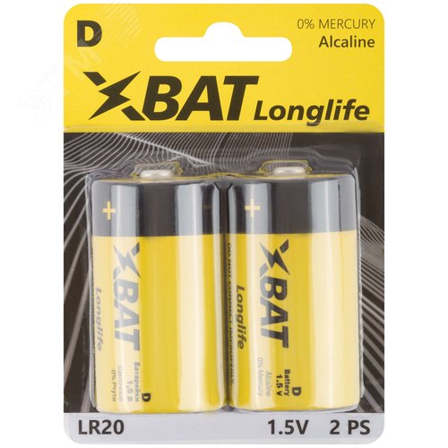 Элемент питания щелочной, 1,5 V, тип D, 2 шт