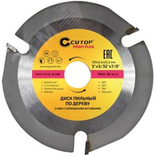 Диск пильный по дереву для УШМ, 3 зуба с карбидными вставками Cutop Profi Plus 125x2.2x22.2мм