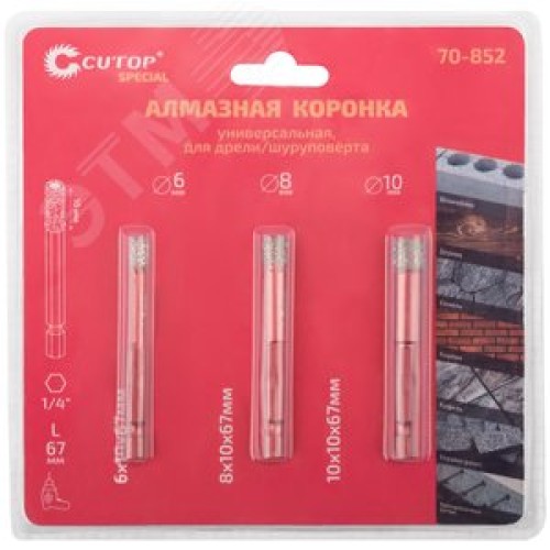 Набор коронок алмазных универсальных Special, шестигранный хвостовик 1/4'', 6/8/10X10x67 мм