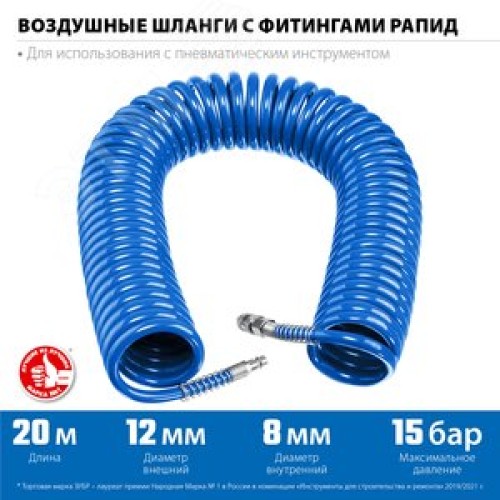 Шланг спиральный воздушный с фитингами рапид 20 м, 8х12 мм, 15 бар, Професиионал