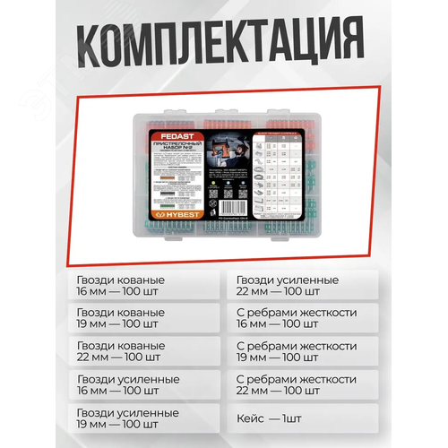 Преимущества Разнообразие размеров — набор включает гвозди длины 16, 19, 22 мм, что позволяет подобрать оптимальный крепеж для различных типов работ