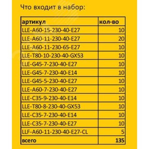 Преимущества Выбран разнообразный ассортимент ламп категории А, нет необходимости выбирать в прайсе
