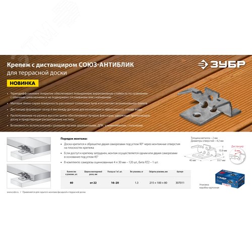 Крепеж с шипами для террасной доски Союз-Антиблик, термодиффузионное покрытие, с саморезами и битой, 60 шт, Профессионал
